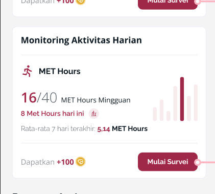Masih bingung? Kami bisa membantu menghitung MET hours Anda! Masukkan aktivitas latihan Anda hari ini ke dalam program check-in di Homepage, dan lihat seberapa dekat Anda dengan target!