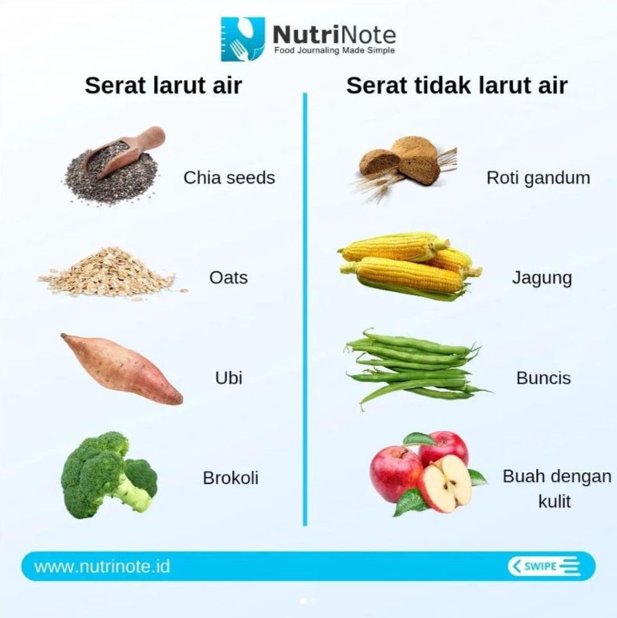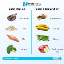 Serat Tidak Larut Air: Tidak menyerap air dan membantu mempercepat pergerakan makanan dalam saluran pencernaan, mendukung pencernaan yang sehat. Ditemukan dalam kulit buah, sayuran, dan gandum utuh.